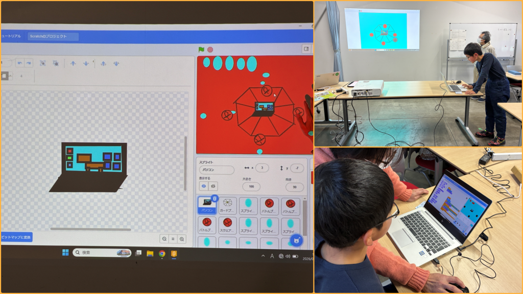 水色のスプライトは初期位置として配置してウィルスのスプライトはプログラムの開始時にそれぞれ水色の「スプライトに行く」という命令が設定されています。そこからスタートして少しずつパソコンにウィルスが移動するようにプログラミングされています。1画面しかなかったですが、こうすることによってウィルススプライトのプログラムは変更せずとも水色のスプライトの位置をステージごとや用途によって配置換えすることで容易に場面やストーリーを変更することができます。なかなか考えたなぁと感心してしまいました。彼は以前、最初のころはスタートの旗が押された時のプログラミング(所謂、初期設定)が苦手なのかな?と感じるところがありましたが、ストーリー性をもってロジカルにプログラミング出来てきてると感じます。これからも楽しみです。