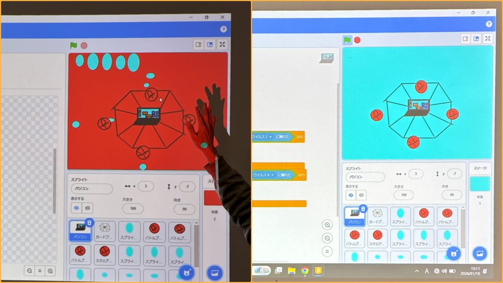 前回まで釣りゲームを作成してくれた彼は、今回はパソコンにウィルスが感染するのを阻止するというストーリーの作品になっています。とても工夫されているところを紹介します。画像でもわかるように背景を赤にしてみていますが本当は水色の背景です。